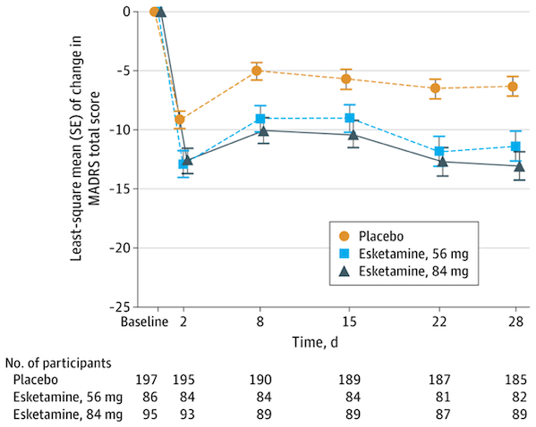 Spravato的市场成功,不仅得益于其快速起效的特性,也与其不断扩展的适应症密切相关。最初,Spravato被批准与口服抗抑郁药联合使用,用于治疗对至少两种不同抗抑郁药反应不佳的成人难治性抑郁症(TRD)。2025年01月21日,强生宣布,FDA批准了Spravato的补充新药申请(sNDA),使其成为首个且唯一一种用于治疗难治性抑郁症的单药疗法。该项批准基于Spravato的一项随机、双盲、多中心、安慰剂对照的关键研究,该研究发表至JAMA Psychiatry(IF=22.5)。研究结果显示,Spravato单独使用在蒙哥马利-阿斯伯格抑郁量表(MADRS)总评分中显示出比安慰剂更快且更优的改善效果。在试验后分析中,Spravato在第28天对所有10项MADRS条目均显示出数值改善。在第4周时,服用安慰剂的患者中有7.6%达到缓解(MADRS总评分≤12),而服用Spravato的患者中有22.5%达到缓解。