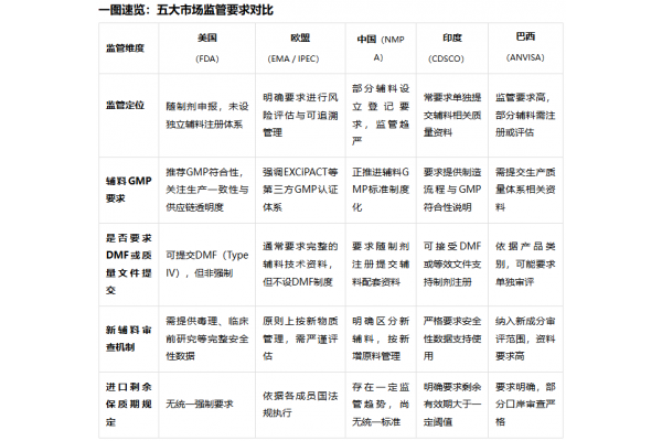 我们从实际注册项目与国际法规经验出发,对美国、欧盟、中国、印度、巴西五大市场的辅料监管政策进行梳理和对比,帮助辅料企业建立全球视角下的合规应对框架。