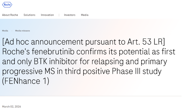 3月2日,罗氏正式对外宣布,其在研的布BTK 抑制剂非奈替尼(fenebrutinib),在针对复发型多发性硬化症(RMS)的关键III期临床研究(FENhance 1)中成功达到主要终点。这意味着,非奈替尼的三项关键III期临床已经全部通关,罗氏手握了一张极具分量的底牌。
