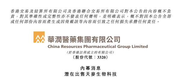 3月16日,华润医药公告,拟以5.1亿元挂牌出售合肥天麦生物科技发展有限公司(以下简称“天麦生物”)5.88%股权。
