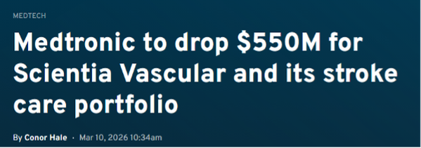 近日,据外媒报道,全球医疗器械巨头美敦力宣布,将斥资5.5亿美元收购Scientia Vascular来加强其卒中治疗产品组合。
