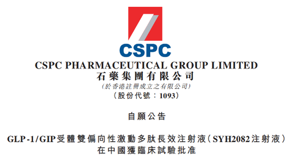 3月20日,石药集团(1093.HK)宣布,本集团开发的GLP-1/GIP受体双偏向性激动多肽长效注射液(SYH2082注射液)(下称:SYH2082)已获中华人民共和国国家药品监督管理局批准,可在中国开展临床试验。SYH2082亦已于2026年2月获美国食品药品监督管理局(FDA)批准,可在美国开展临床试验。