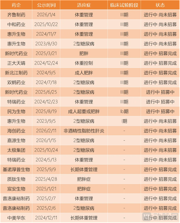 部分临床试验中的GLP-1管线 数据来源:根据公开信息整理