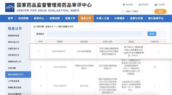 4月6日,艾迪药业宣布,其自主研发的抗艾滋病1类新药ACC085注射液正式获得CDE的临床试验批件,拟用于有HIV-1感染风险的成人及体重≥35kg青少年的暴露前预防(PrEP)。