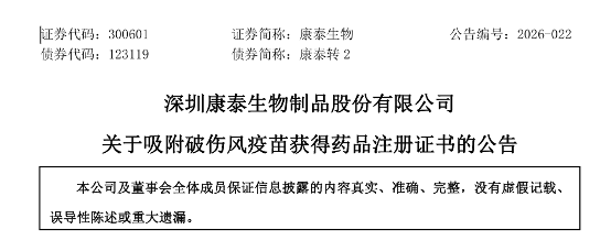 2026年4月3日,深圳康泰生物制品股份有限公司(证券代码:300601)发布公告,其全资子公司北京民海生物科技有限公司研发的吸附破伤风疫苗,正式获得国家药监局签发的《药品注册证书》(国药准字S20260021),证书有效期至2031年3月30日。这标志着国内疫苗头部企业正式入局吸附破伤风疫苗赛道,国产破伤风防控市场的竞争格局将迎来深度重构。